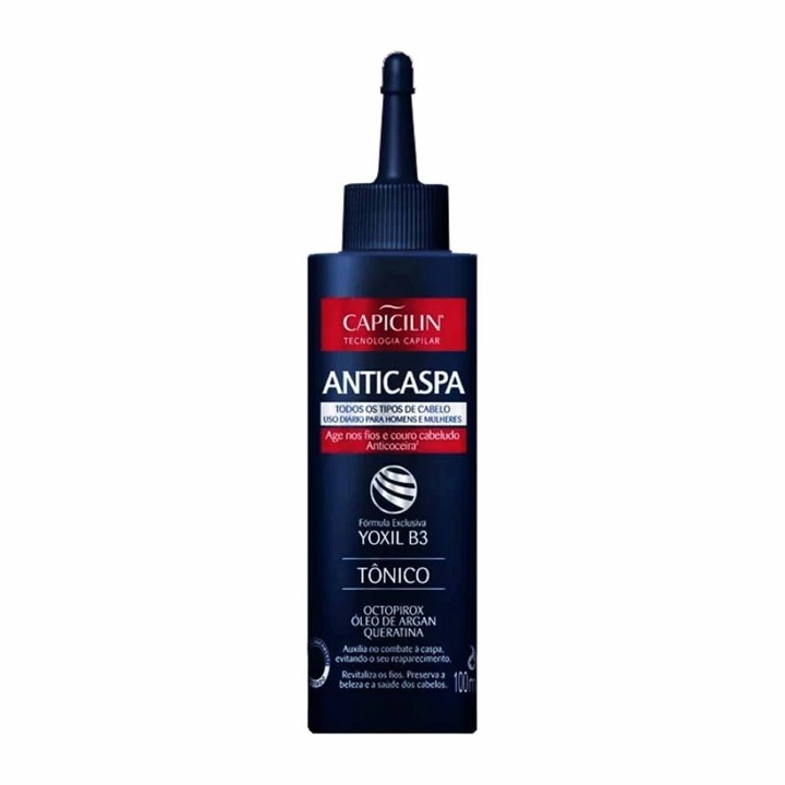 O Tônico Capilar Anticaspa Capicilin 100ml foi desenvolvido após intensas pesquisas para tratar todos os tipos de cabelo de forma eficaz. Sua fórmula exclusiva Yoxil B3 contém Octopirox (Piroctone Olamina), o agente mais eficaz no combate ao fungo causador da caspa (Pityrosporum ovale), além de Óleo de Argan, que possui potente ação antioxidante, e Queratina, que restaura e fortalece as fibras capilares. Esse tônico auxilia na eliminação da caspa, evitando o reaparecimento, ao mesmo tempo que revitaliza os fios e preserva a saúde do couro cabeludo, proporcionando hidratação equilibrada e efeito anticoceira.